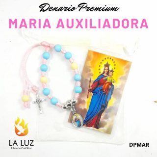 El Denario Premium de María Auxiliadora es un rosario católico devocional inspirado en la protección maternal de la Virgen María Auxiliadora. Elaborado con cuentas en tonos rosa, crema y celeste, cordón resistente, crucifijo metálico y medalla de María Auxiliadora, es ideal para acompañar la oración diaria y fortalecer la devoción mariana.