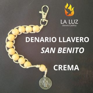 Está elaborado con cuentas redondas en tono crema, ensartadas en cordón resistente, e incluye una medalla de San Benito, reconocida por su oración de protección contra el mal. Cuenta con un gancho metálico tipo llavero, ideal para colocar en llaves, mochila, bolso o automóvil.