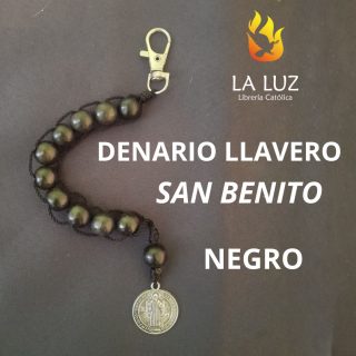 Está elaborado con cuentas redondas en tono negro, ensartadas en cordón resistente, e incluye una medalla de San Benito, reconocida por su oración de protección contra el mal. Cuenta con un gancho metálico tipo llavero, ideal para colocar en llaves, mochila, bolso o automóvil.