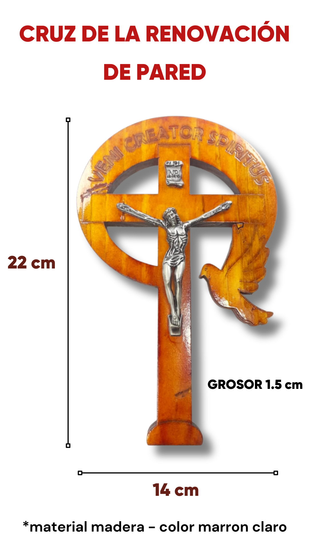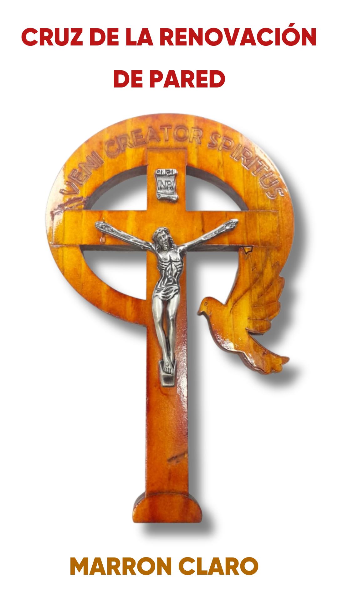 La Cruz de la Renovación Carismatica Católica es un símbolo representativo de la fe, la renovación espiritual y la acción del Espíritu Santo. Elaborada en madera de tono marrón claro, presenta el crucifijo de Cristo al centro, rodeado por un diseño circular que simboliza la eternidad y la presencia de Dios Padre, con la inscripción “Veni Creator Spiritus”. A un costado se destaca la figura de la paloma, signo del Espíritu Santo, elemento central de la espiritualidad de la Renovación Católica.
