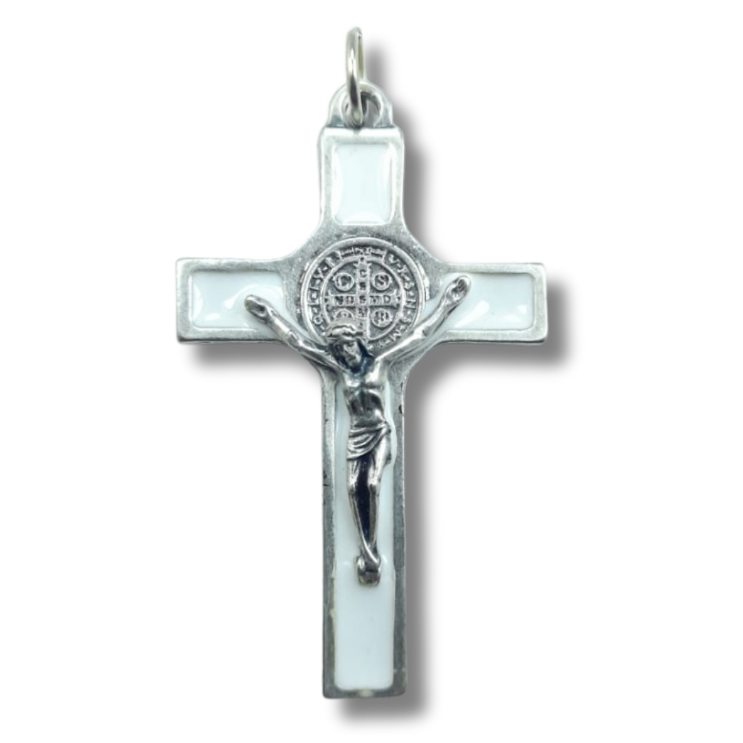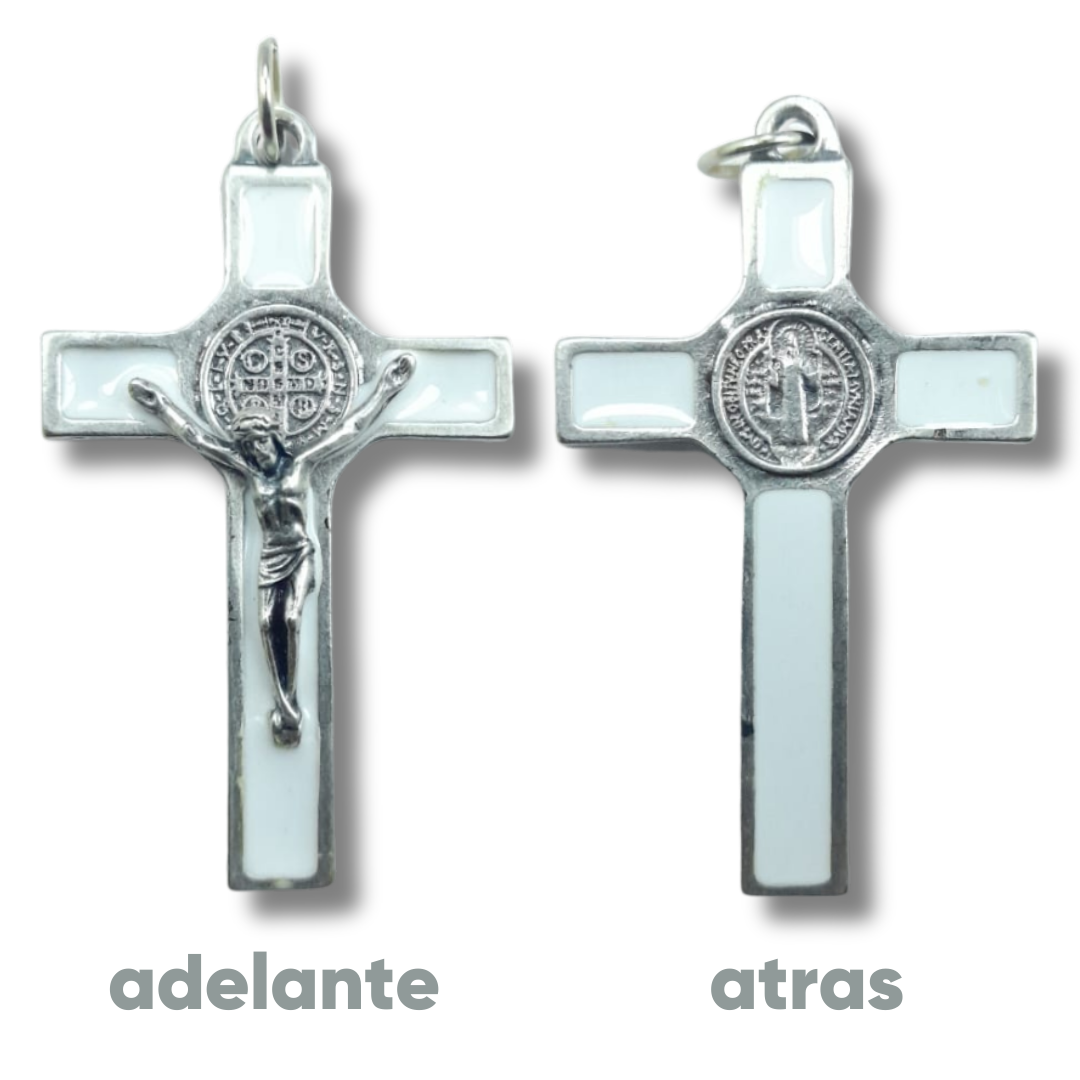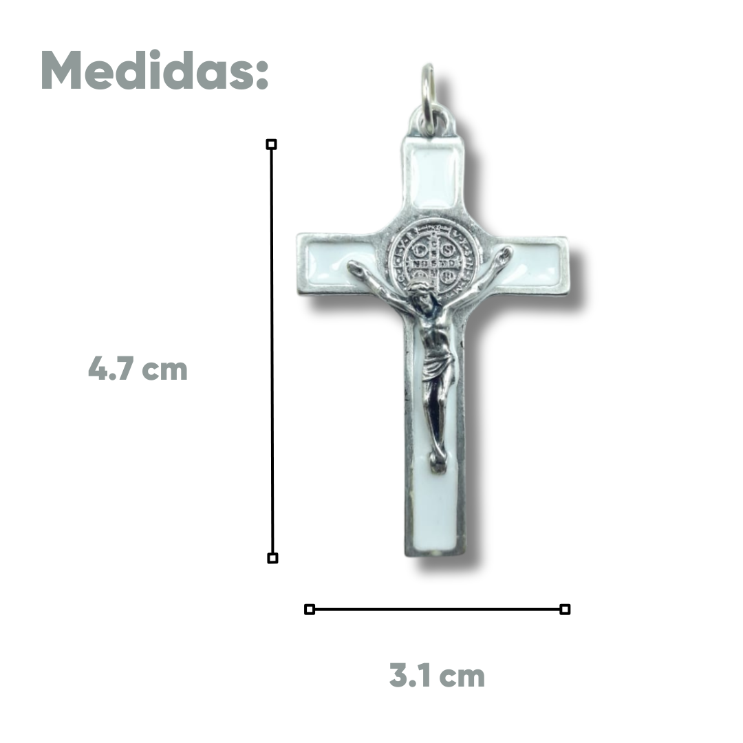 Clásica y elegante Cruz de San Benito elaborada en metal resistente, con acabado esmaltado en color blanco que realza su diseño y simbolismo. Presenta la imagen de Jesucristo crucificado en relieve y, en el centro, la Medalla de San Benito, reconocida en la tradición católica como un poderoso signo de protección, fe y fortaleza espiritual.