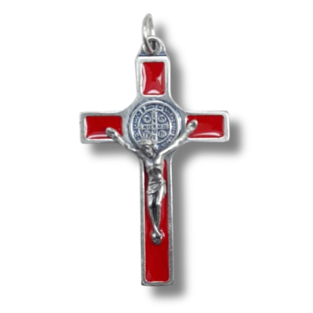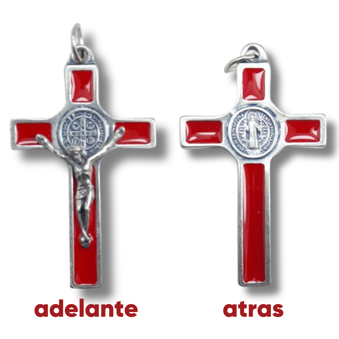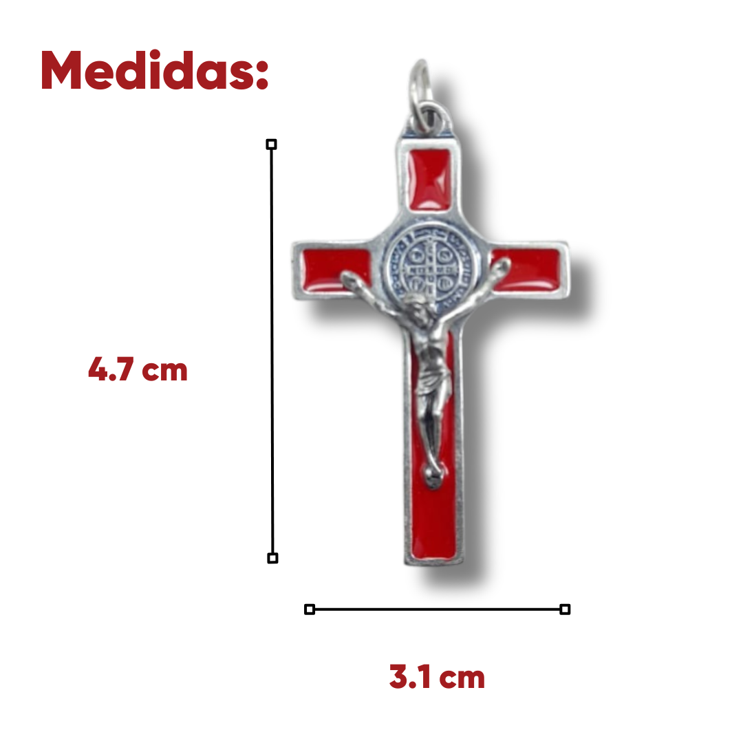 Clásica y elegante Cruz de San Benito elaborada en metal resistente, con acabado esmaltado en color rojo que realza su diseño y simbolismo. Presenta la imagen de Jesucristo crucificado en relieve y, en el centro, la Medalla de San Benito, reconocida en la tradición católica como un poderoso signo de protección, fe y fortaleza espiritual.