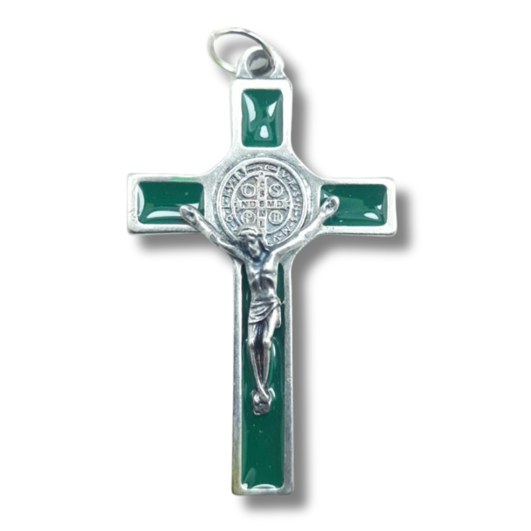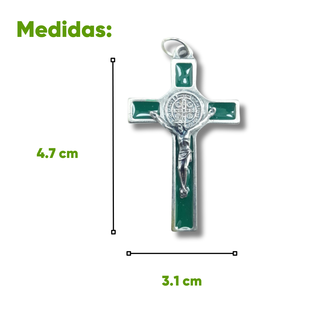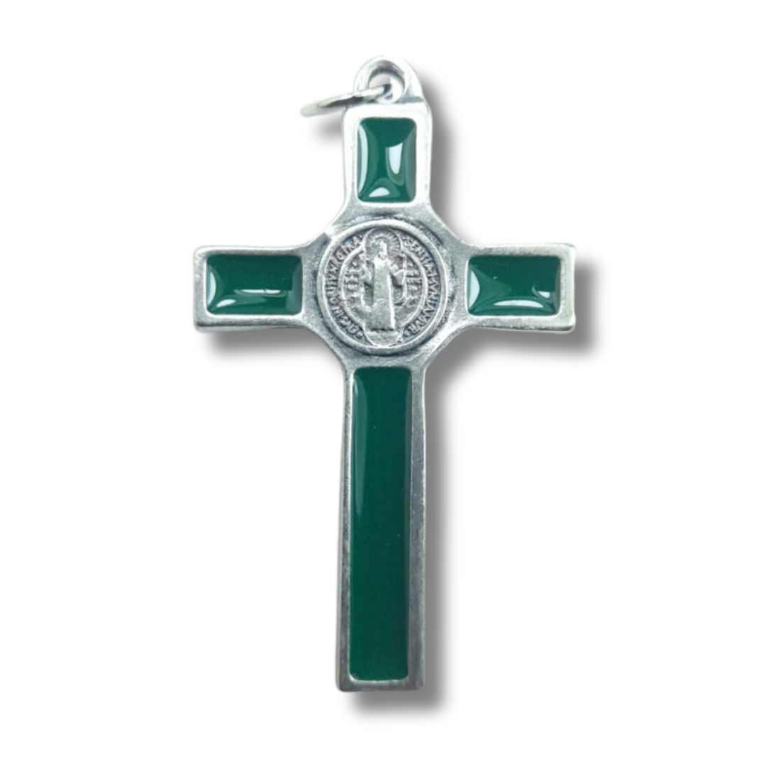Clásica y elegante Cruz de San Benito elaborada en metal resistente, con acabado esmaltado en color verde que realza su diseño y simbolismo. Presenta la imagen de Jesucristo crucificado en relieve y, en el centro, la Medalla de San Benito, reconocida en la tradición católica como un poderoso signo de protección, fe y fortaleza espiritual.
