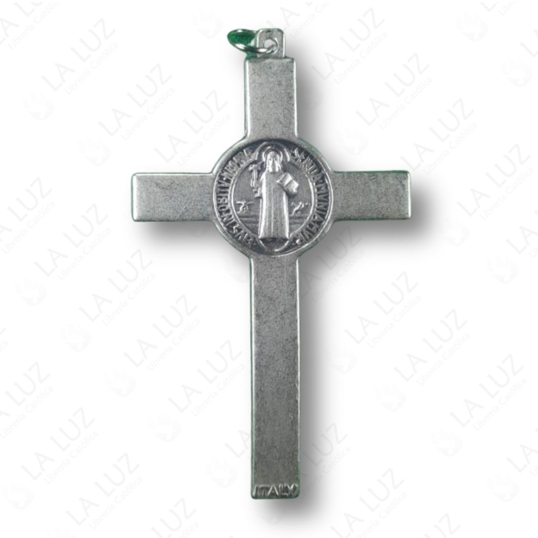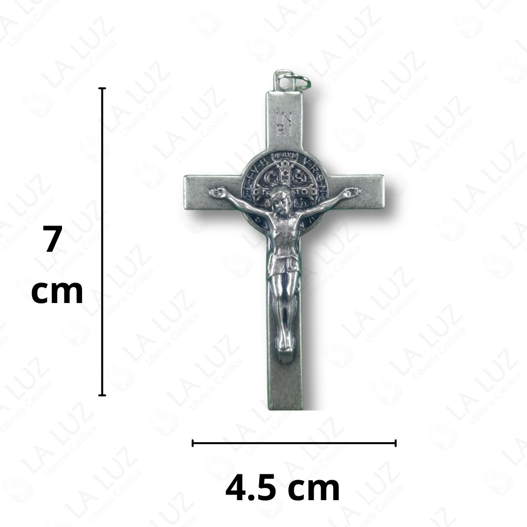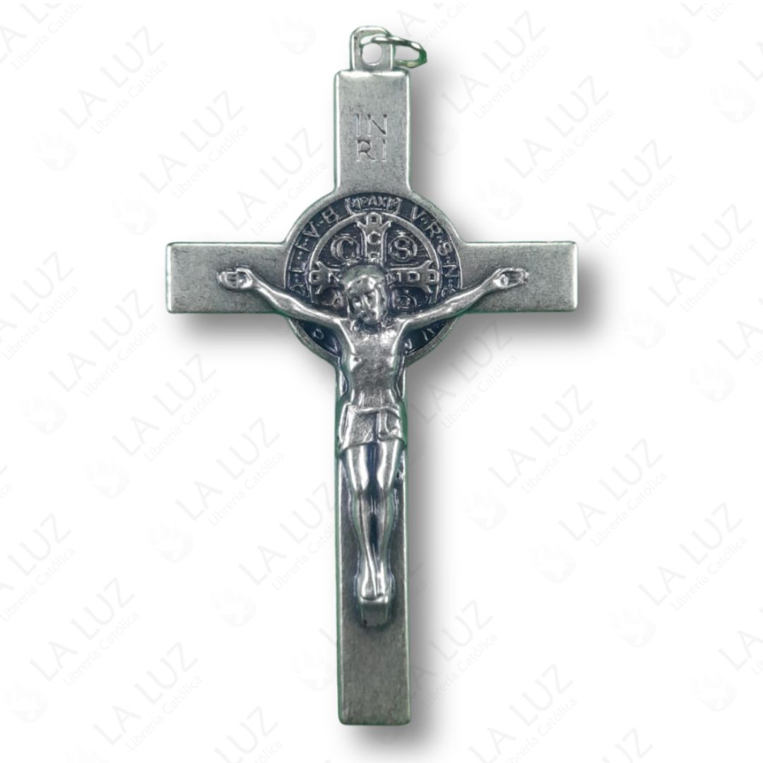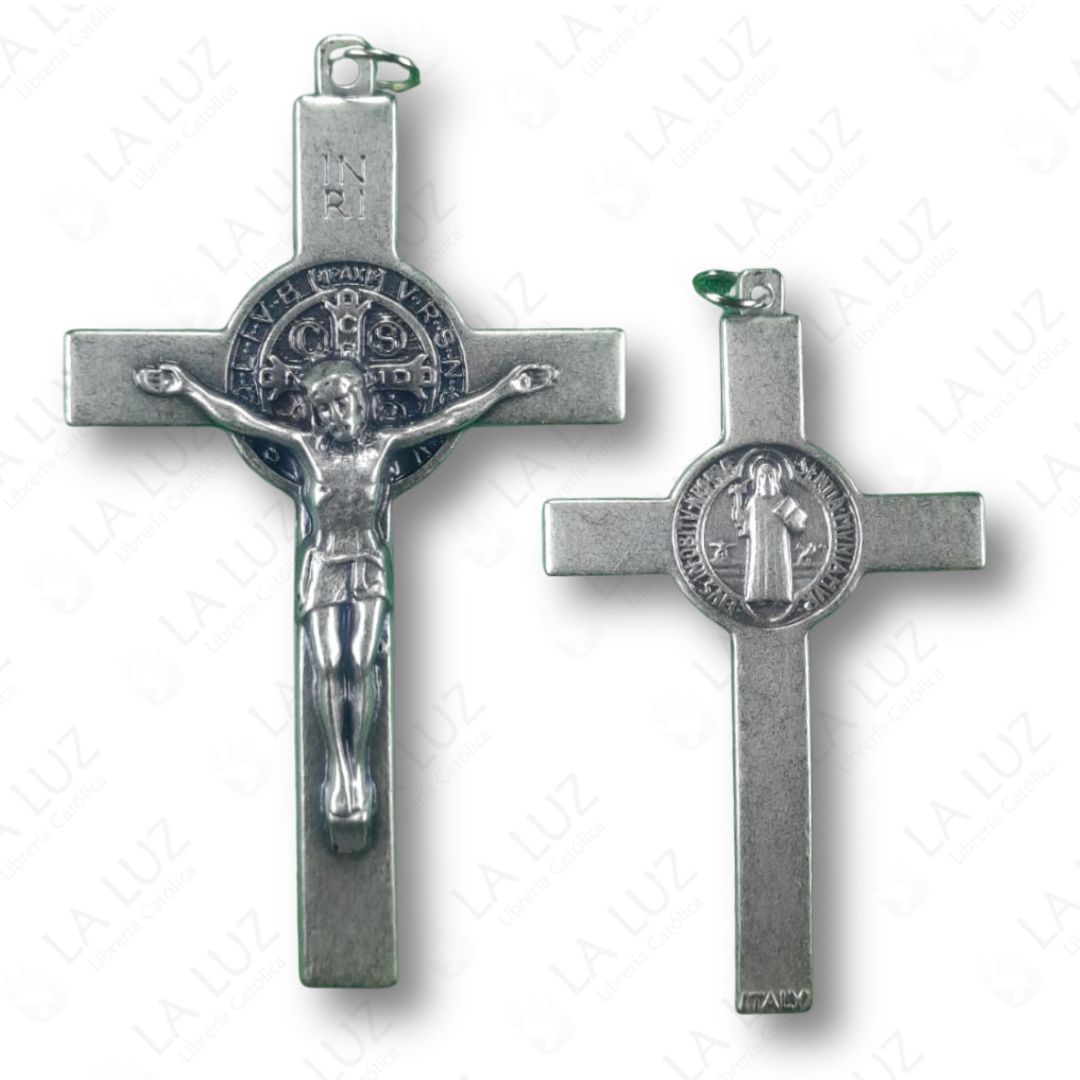 Cruz de San Benito mediana en metal plateado con Cristo crucificado y medalla protectora. Ideal para uso personal, colgante o regalo religioso.