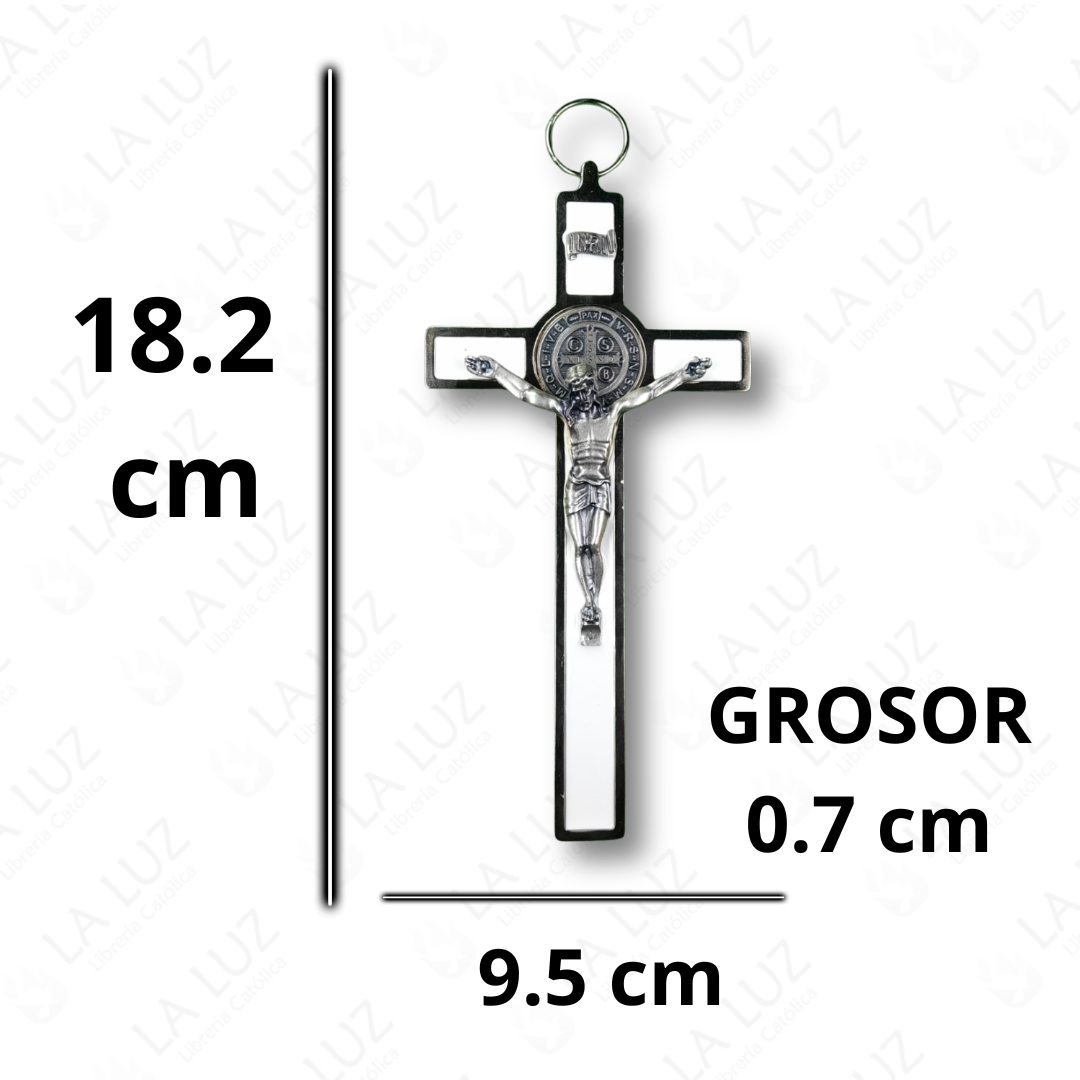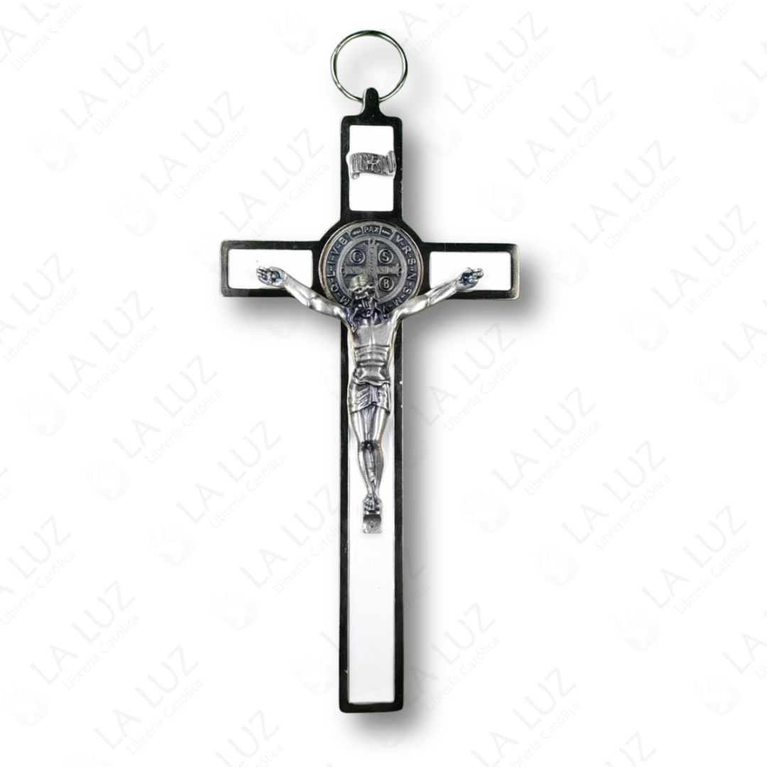 Cruz de San Benito metálica color blanco con Cristo y medalla doble cara. Crucifijo católico ideal para pared, protección espiritual del hogar y decoración religiosa.