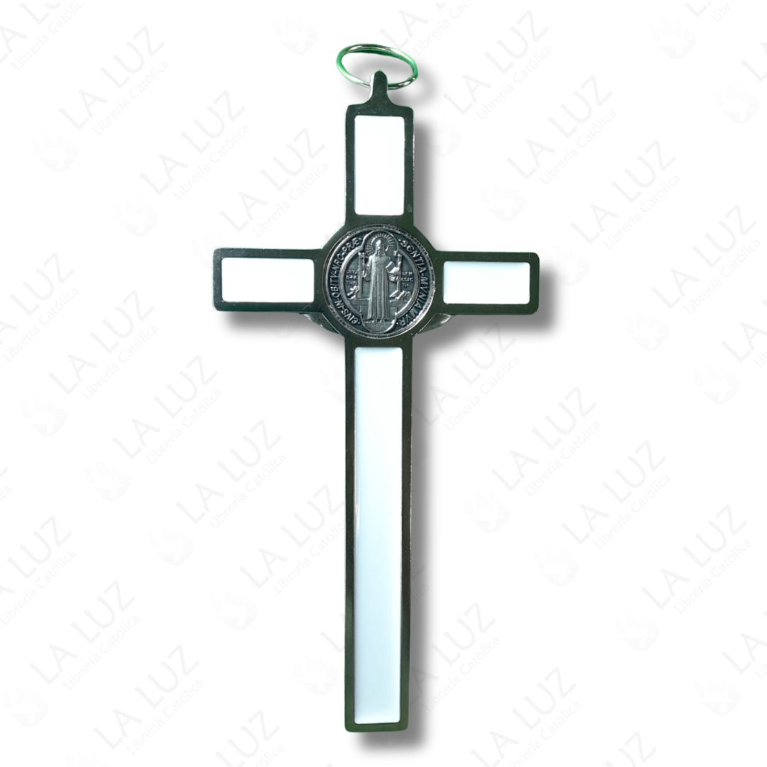 La Cruz de San Benito metálica color blanco es un símbolo poderoso de fe y protección espiritual dentro de la tradición católica. Su diseño elegante combina el acabado blanco brillante con detalles metálicos plateados que resaltan la figura de Cristo crucificado y la medalla de San Benito.