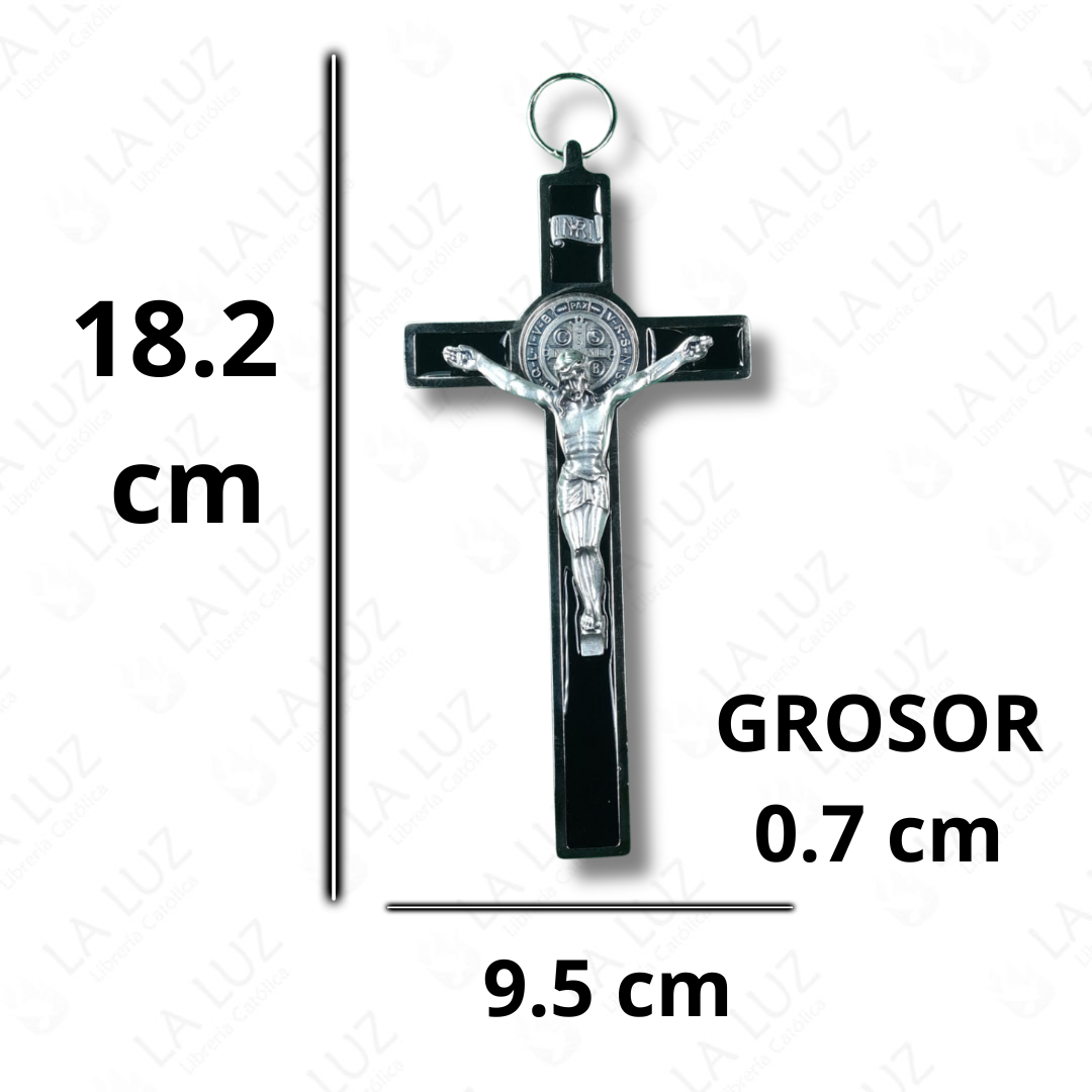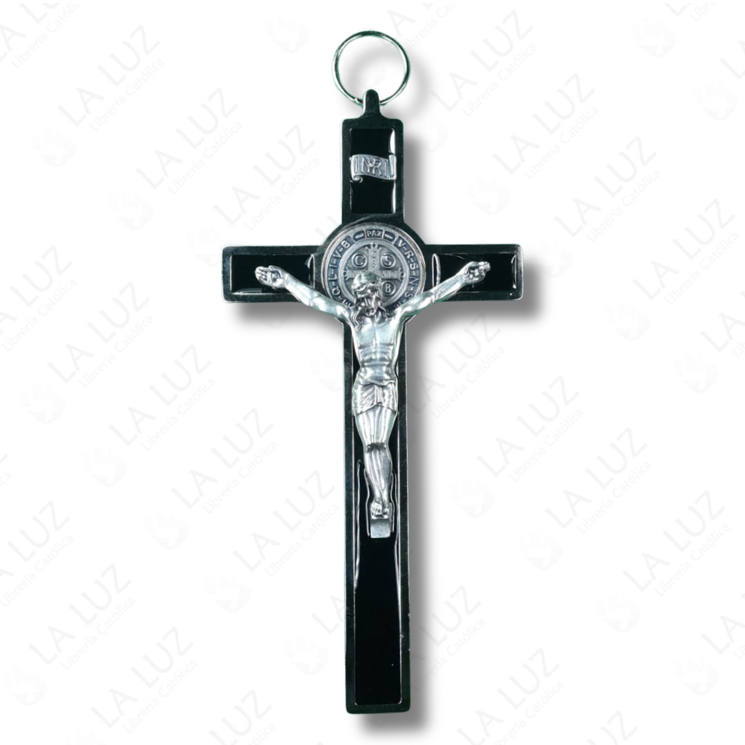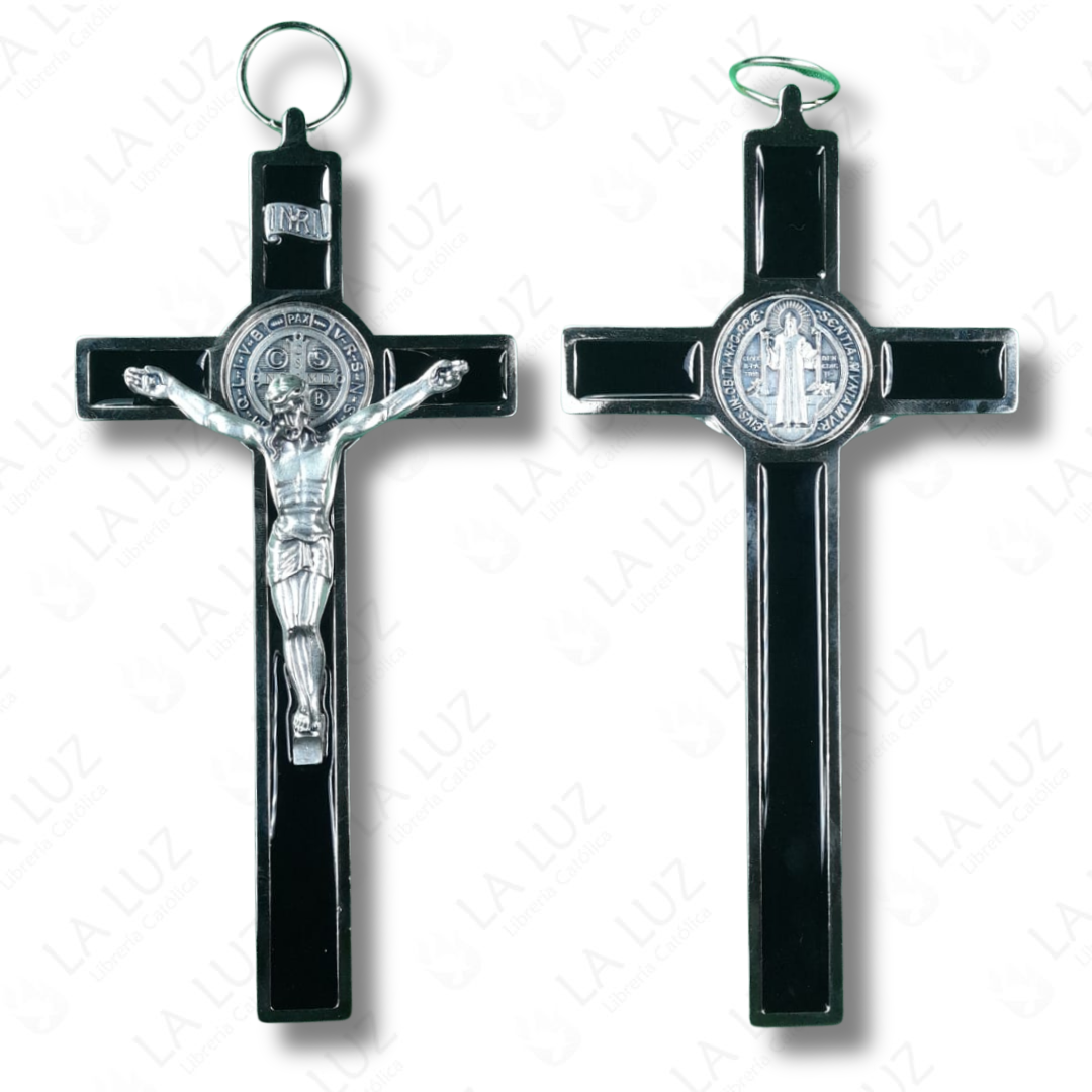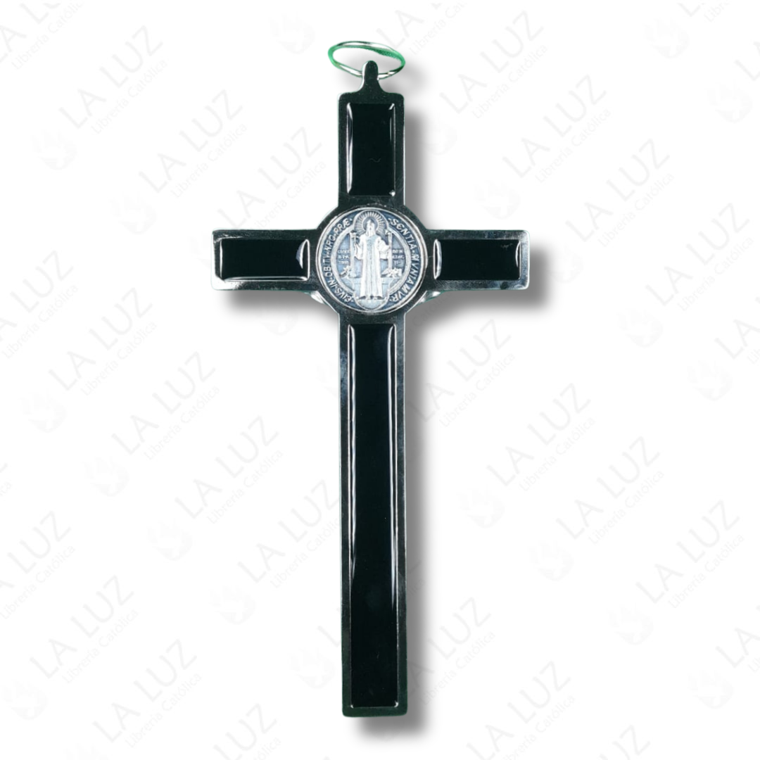 Cruz de San Benito metálica color negro con Cristo y medalla doble cara. Crucifijo católico ideal para pared, protección espiritual del hogar y decoración religiosa.