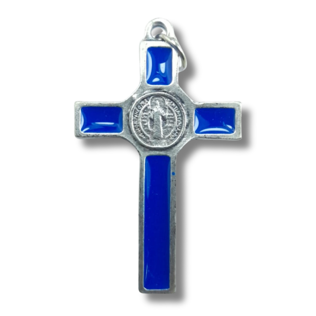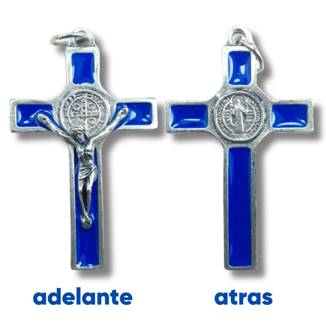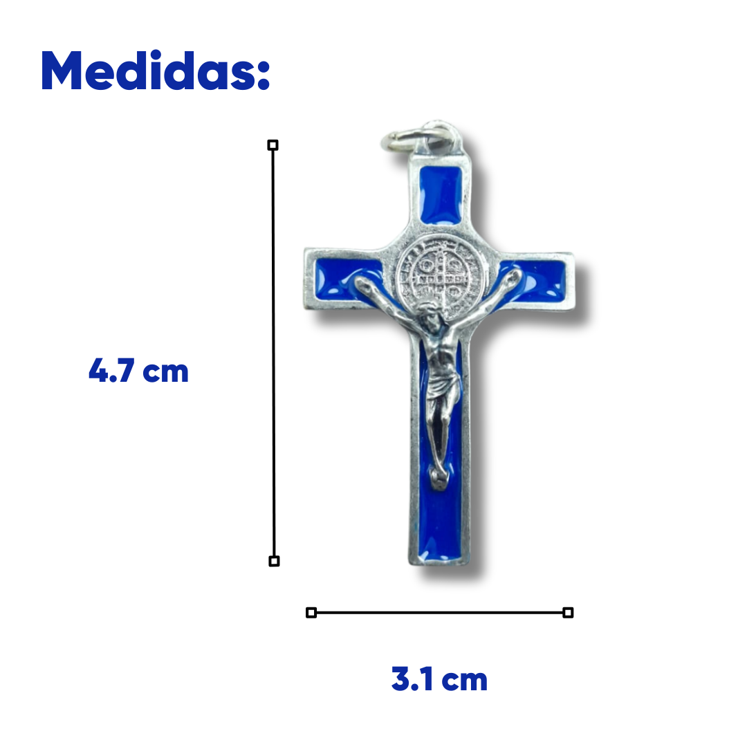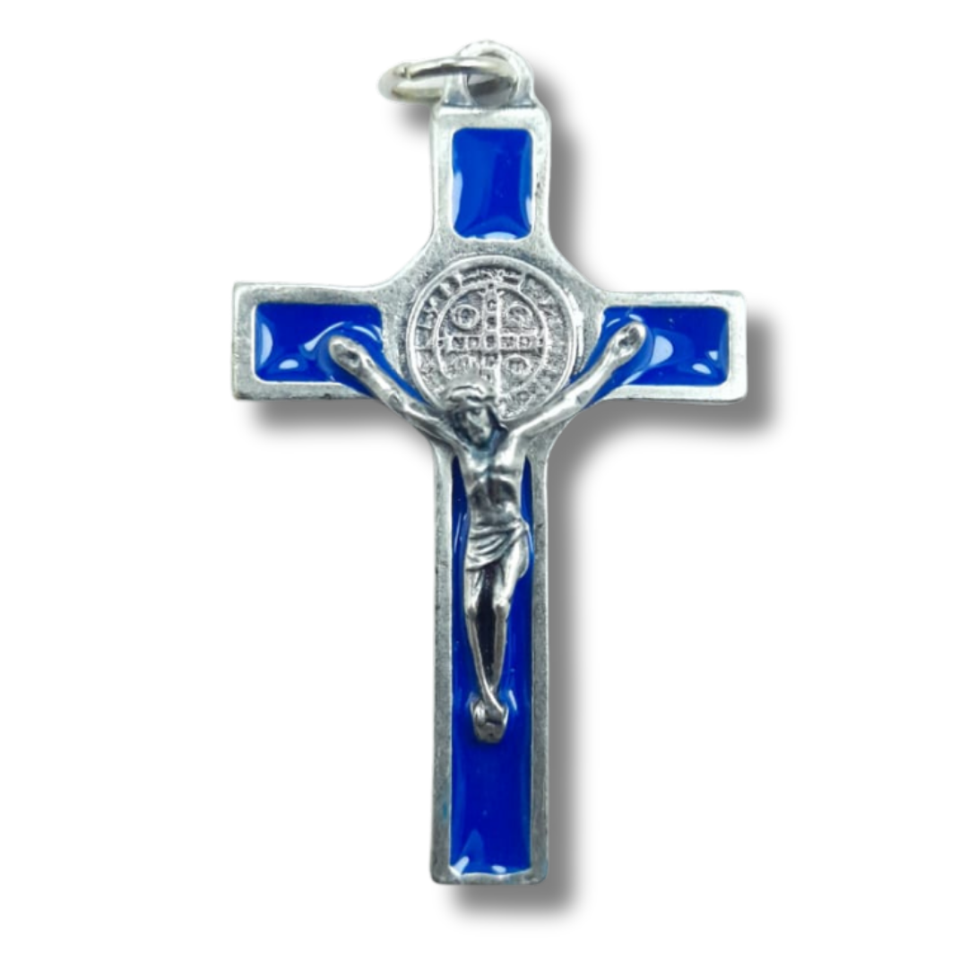 Clásica y elegante Cruz de San Benito elaborada en metal resistente, con acabado esmaltado en color azul que realza su diseño y simbolismo. Presenta la imagen de Jesucristo crucificado en relieve y, en el centro, la Medalla de San Benito, reconocida en la tradición católica como un poderoso signo de protección, fe y fortaleza espiritual.