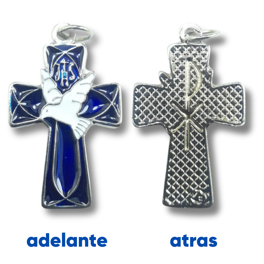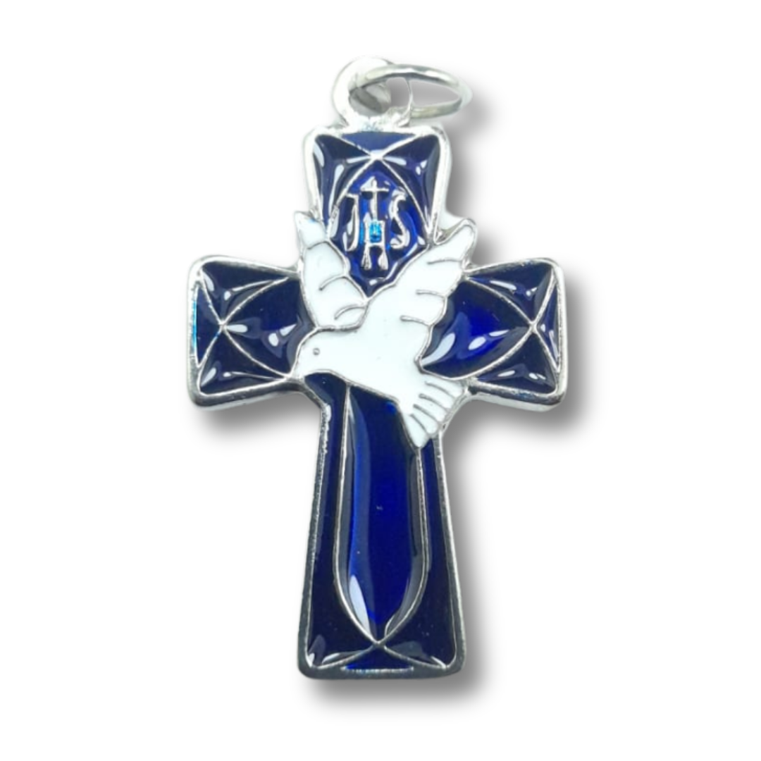 Elegante cruz del Espíritu Santo elaborada en metal de alta calidad, con un refinado acabado esmaltado en color azul profundo. En el centro destaca la imagen de la paloma del Espíritu Santo, símbolo de paz, guía divina y presencia de Dios, representada en color blanco para un contraste armonioso y significativo.