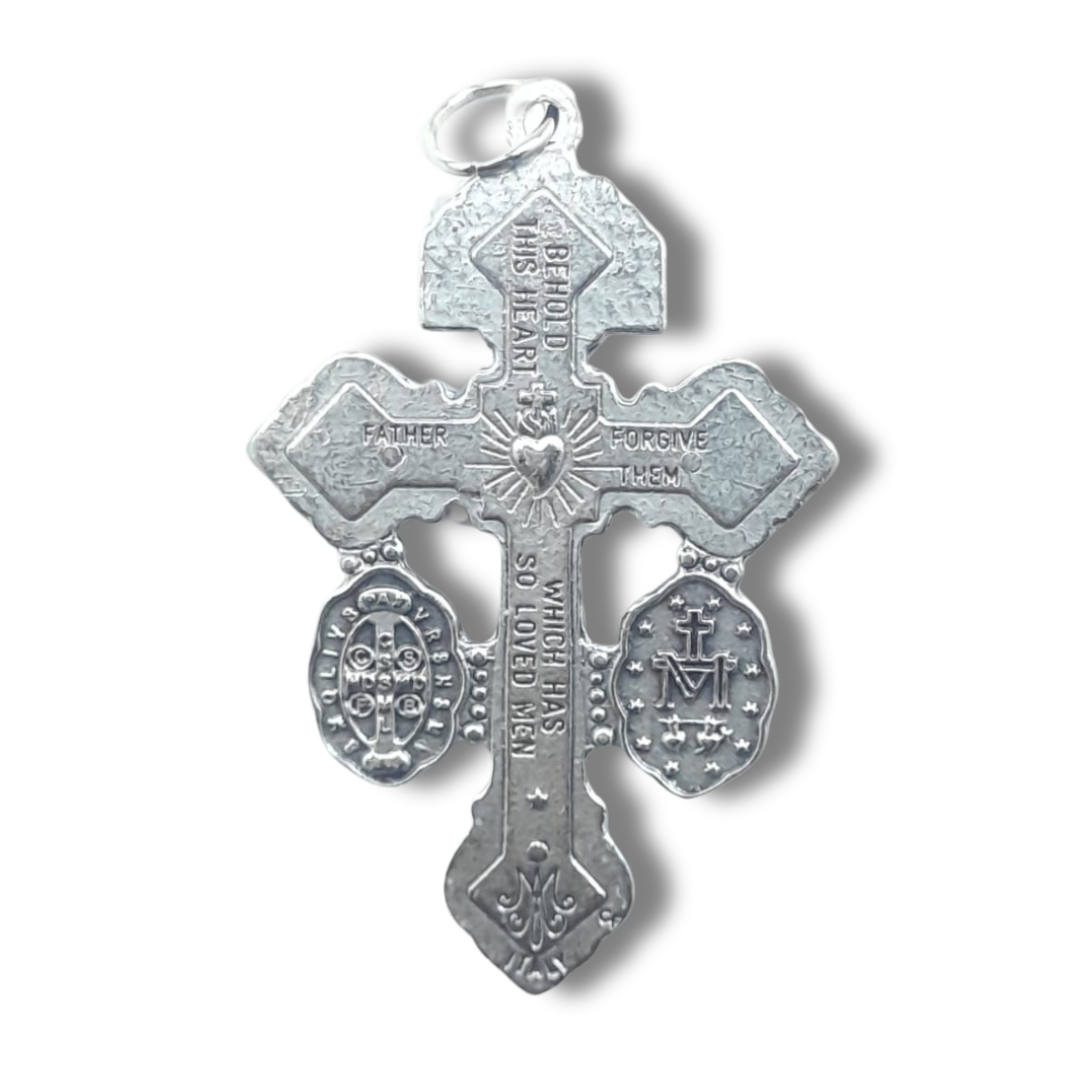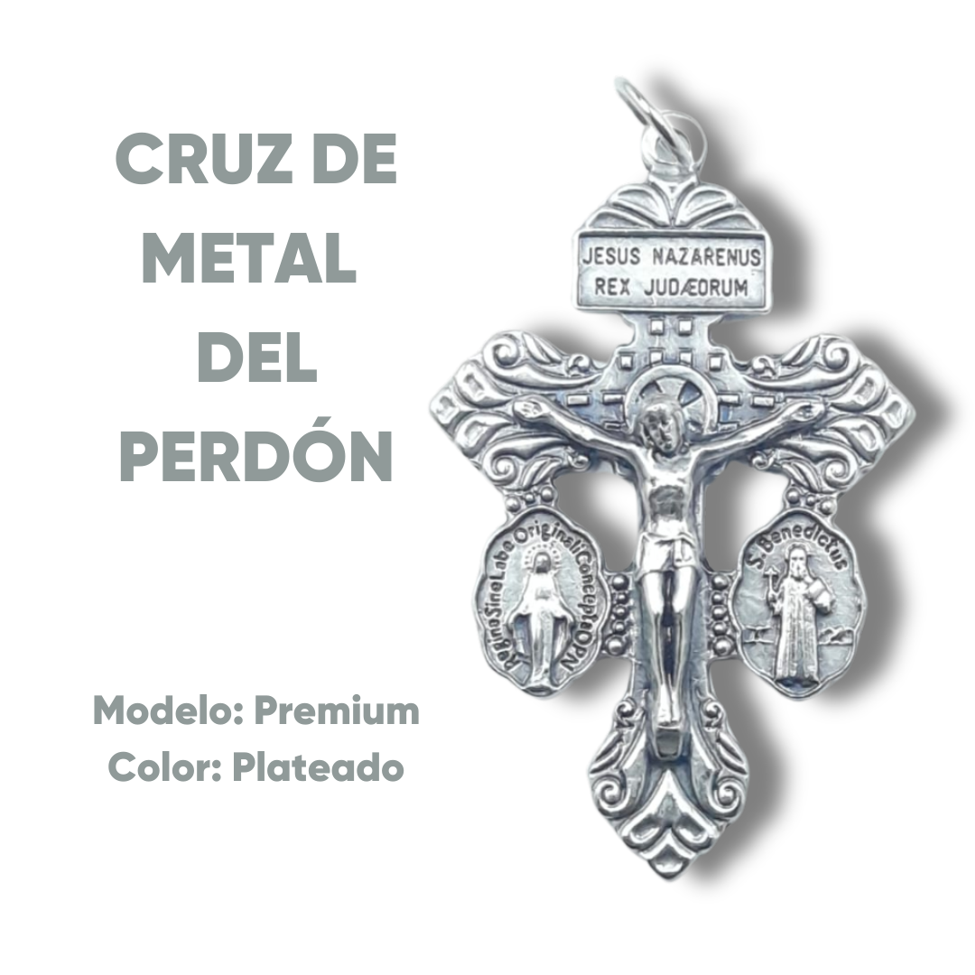 Hermosa Cruz del Perdón elaborada en metal con acabado plateado, de diseño clásico y detallado.