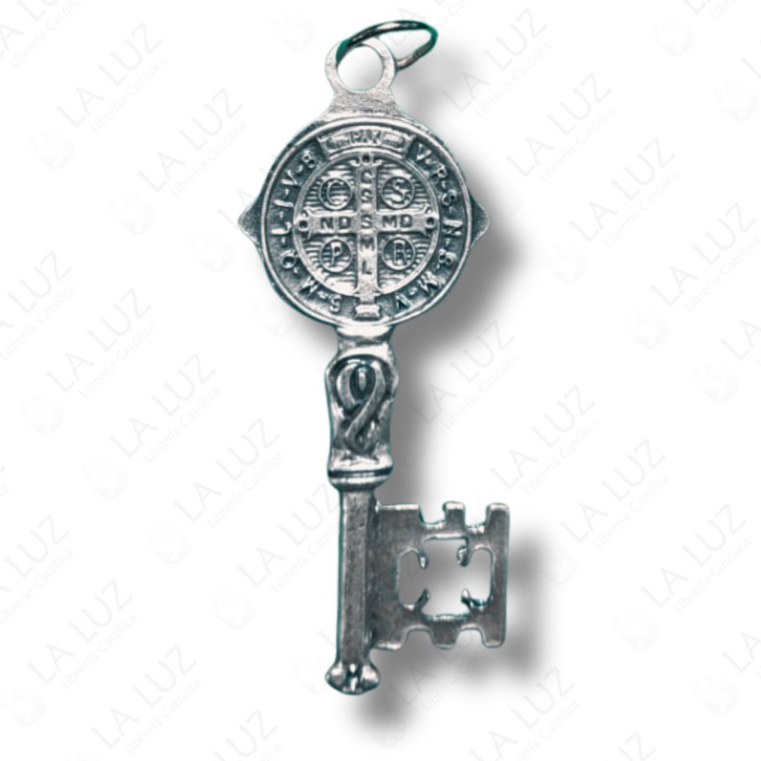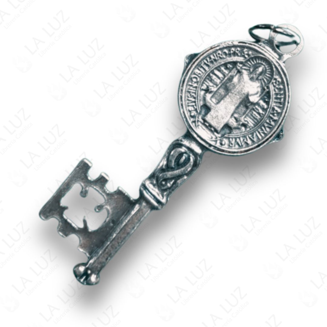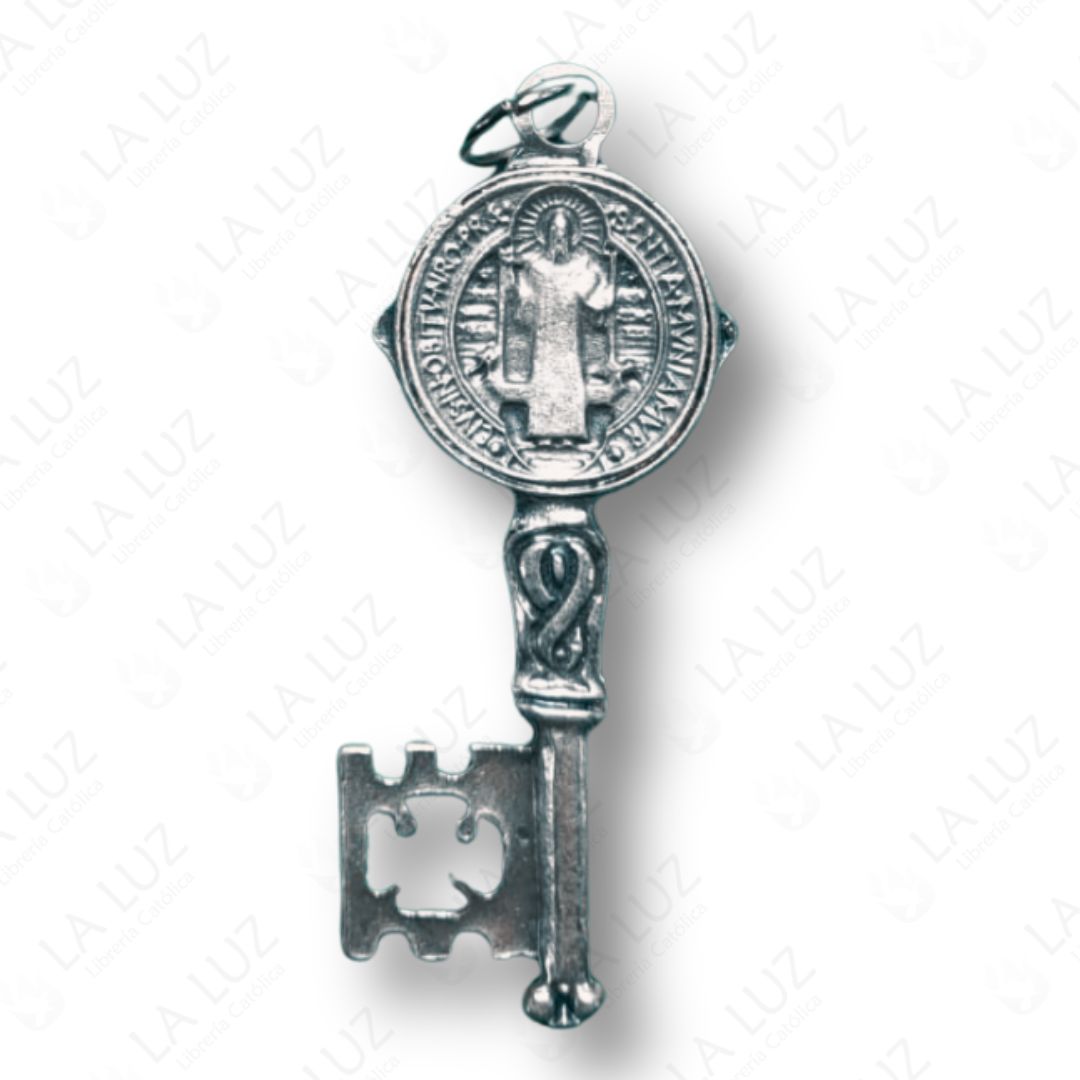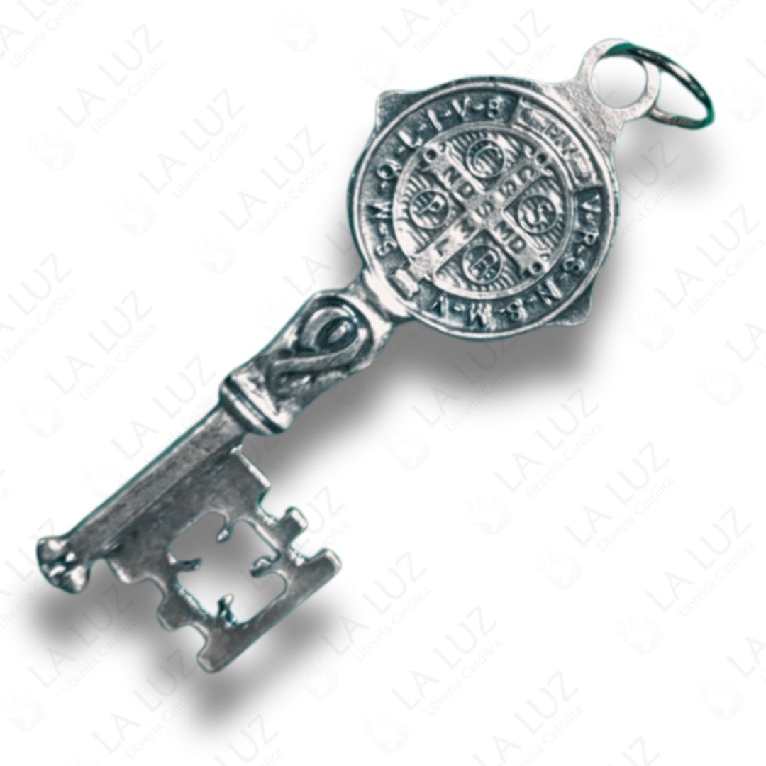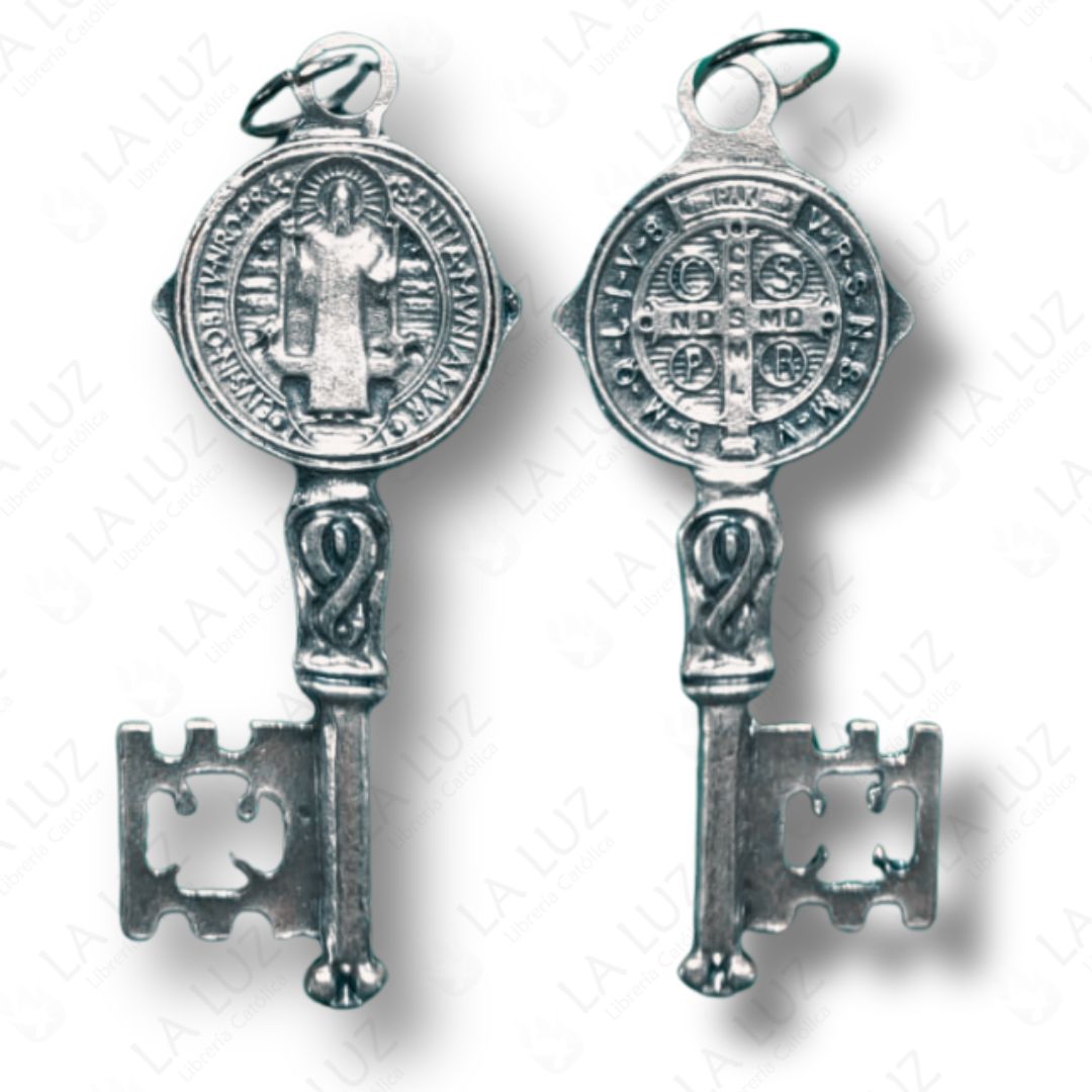 La Llave de San Benito en metal plateado, con diseño doble cara, es un poderoso sacramental católico asociado a la protección espiritual y la bendición del hogar y de la persona.