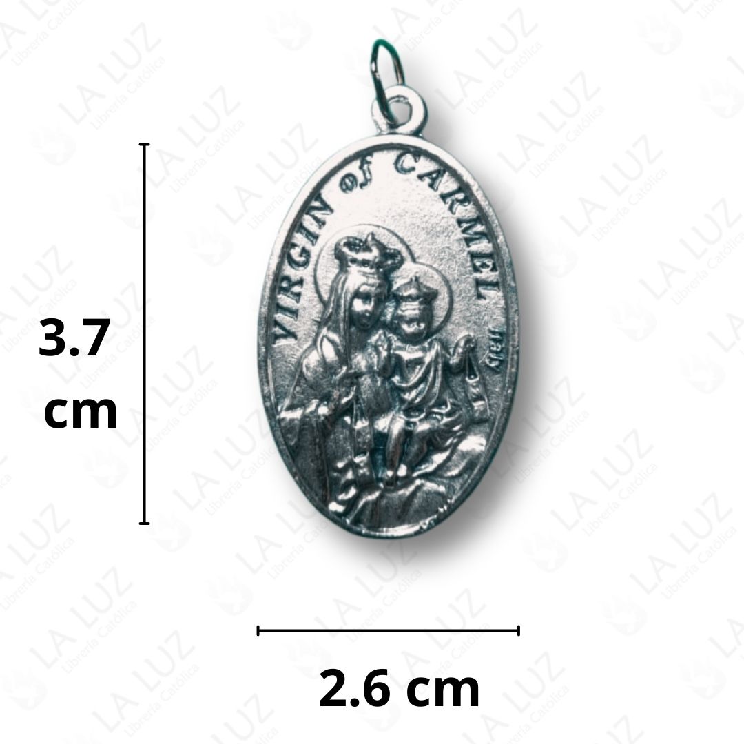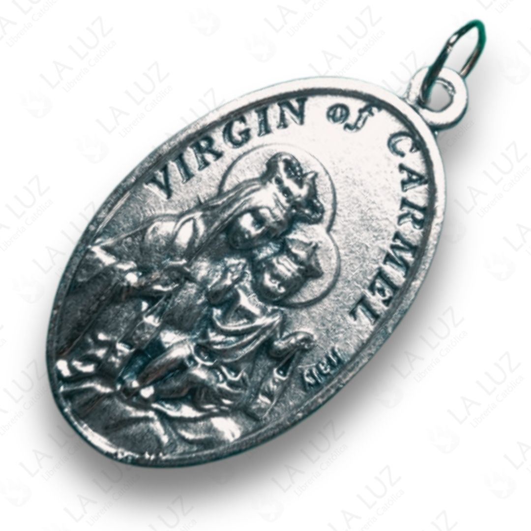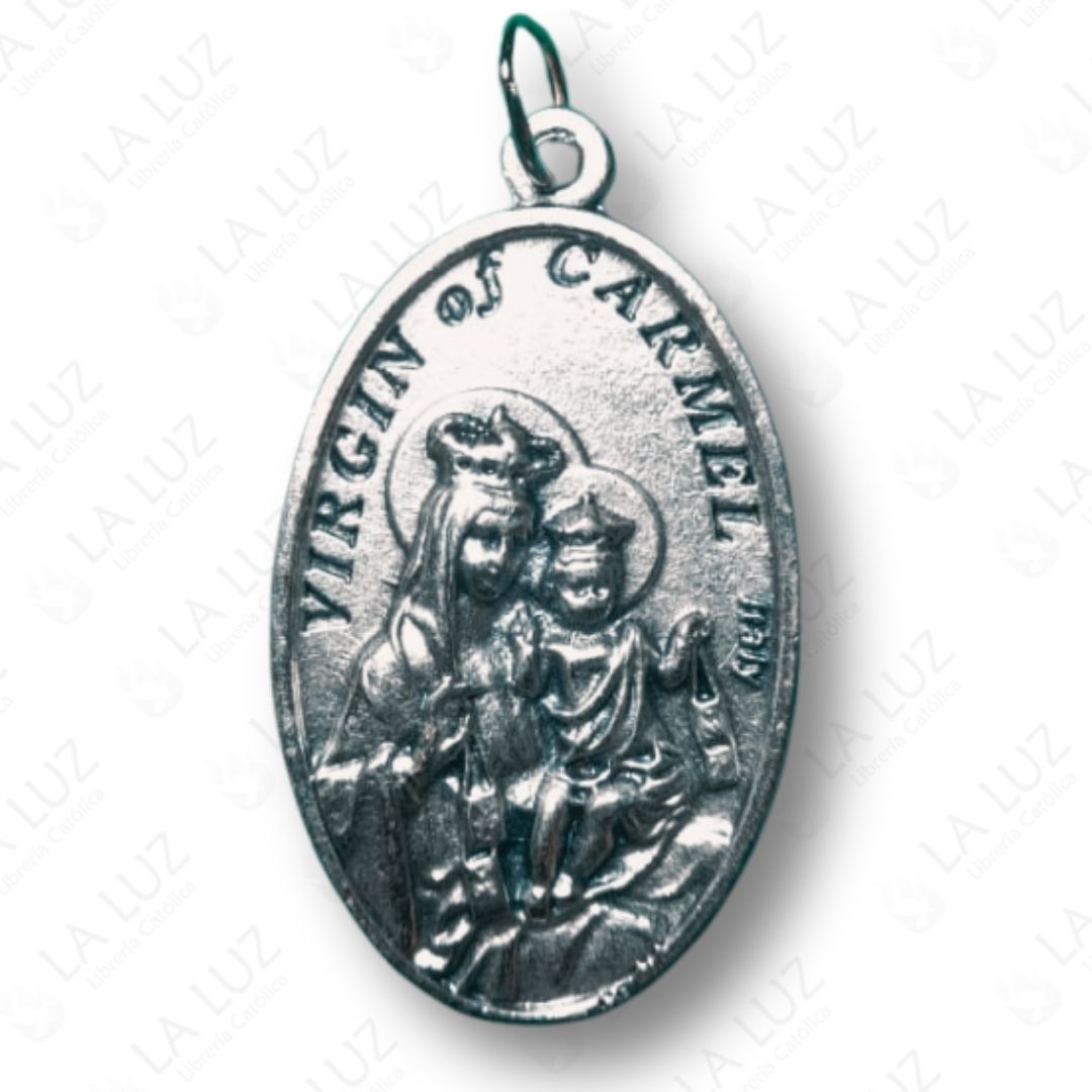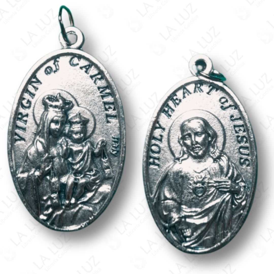 Medalla doble cara Virgen del Carmen y Sagrado Corazón de Jesús en metal plateado. Protección y fe católica para uso diario.