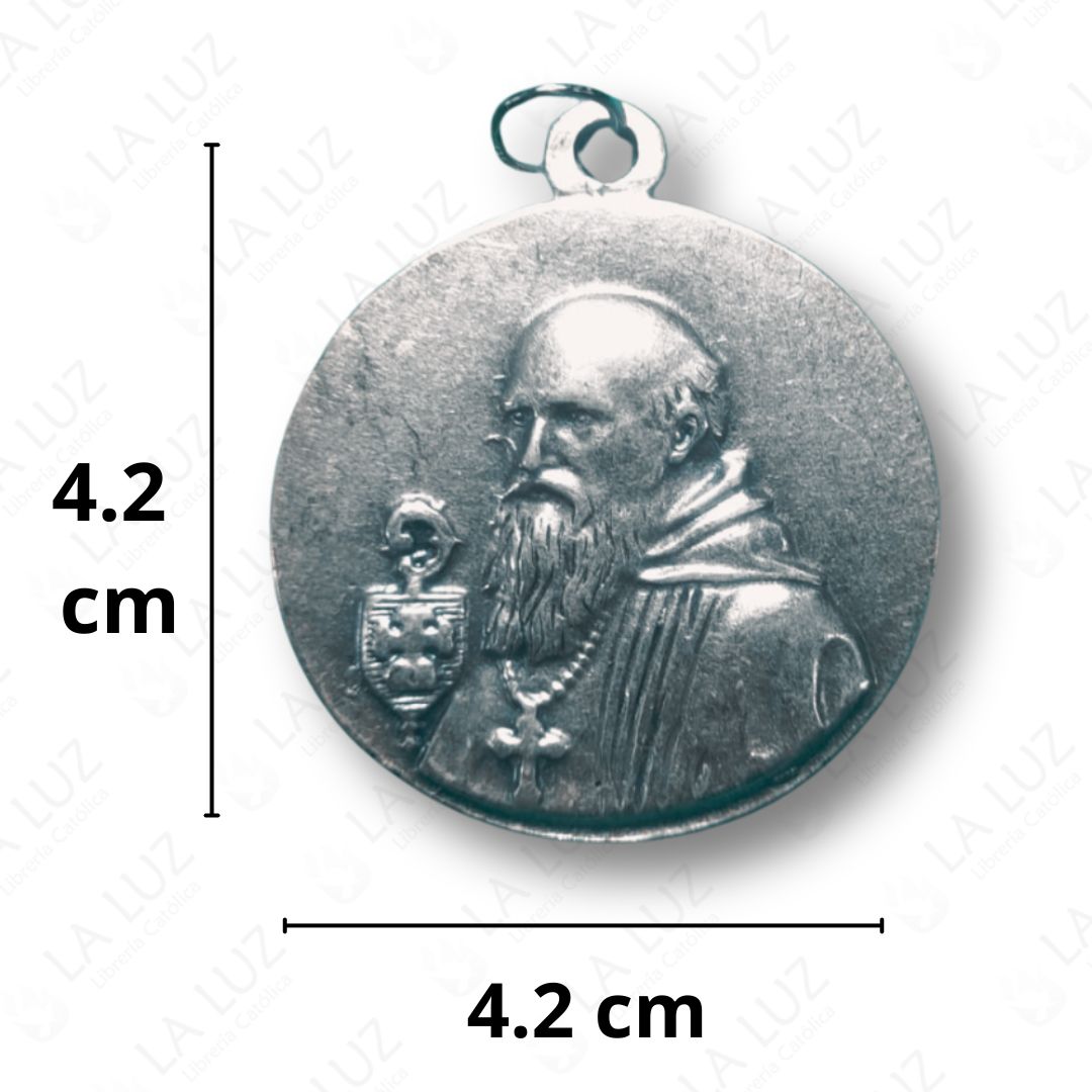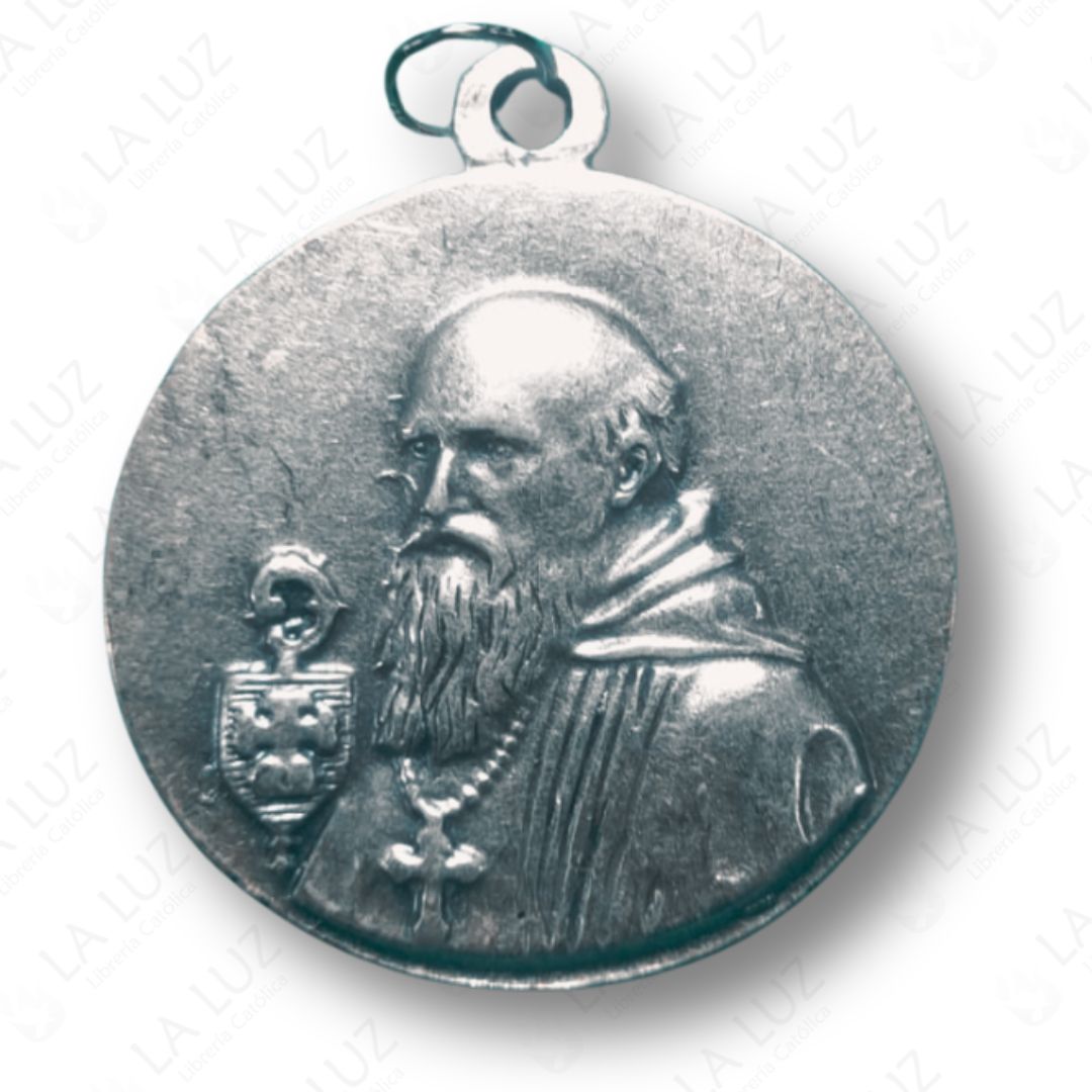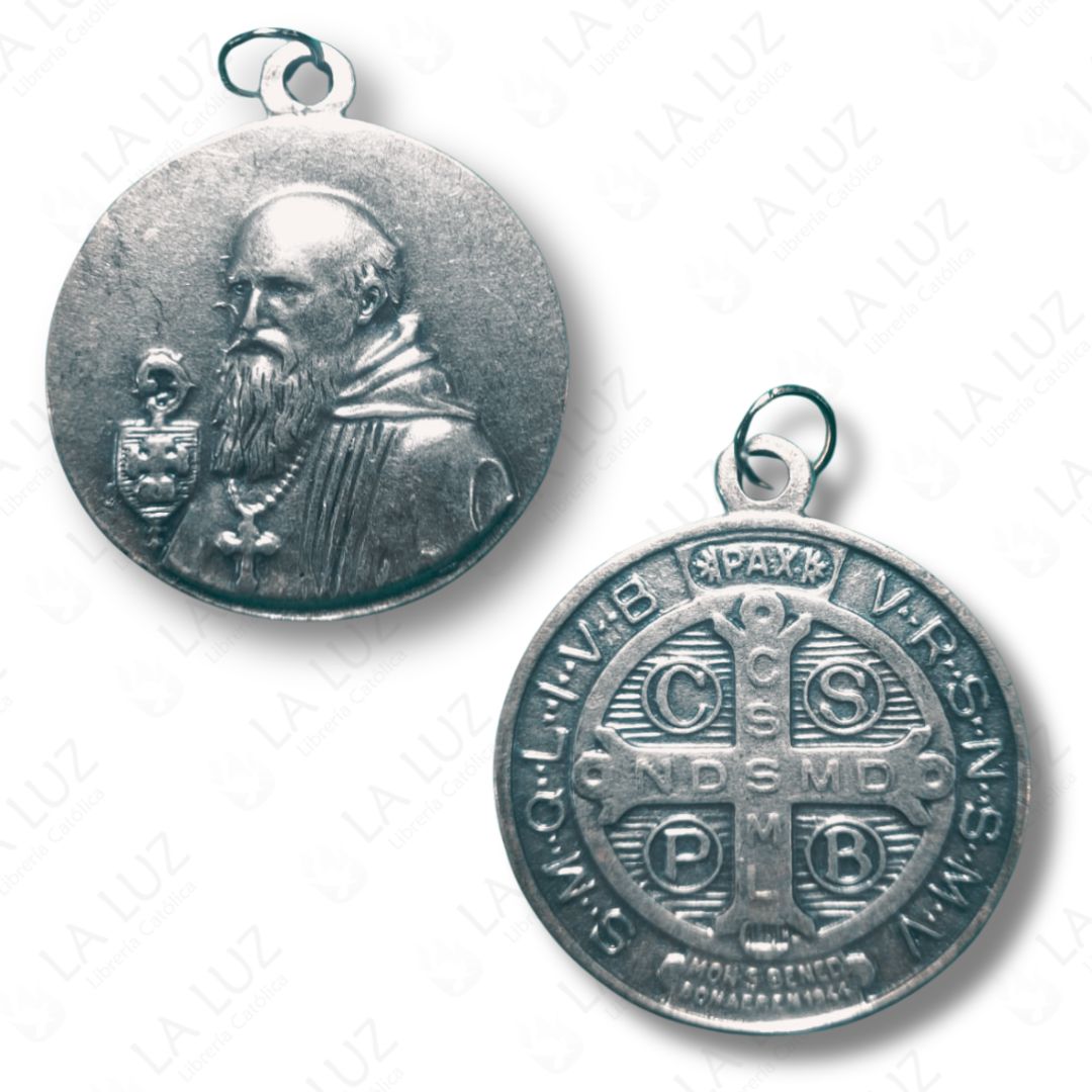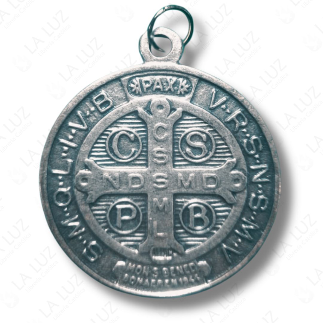 Medalla redonda de San Benito en metal plateado, símbolo de protección espiritual y fe católica. Ideal para colgante, rosario o regalo religioso.