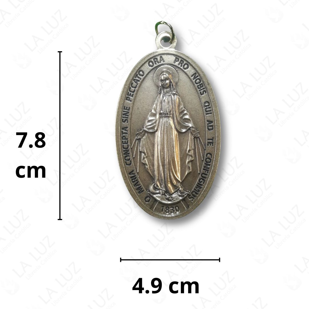 Hermosa Medalla Milagrosa grande, elaborada en metal plateado con relieve detallado. Presenta en el anverso a la Virgen María con los brazos abiertos derramando gracias, acompañada de la inscripción tradicional “Oh María concebida sin pecado, ruega por nosotros que recurrimos a ti”.