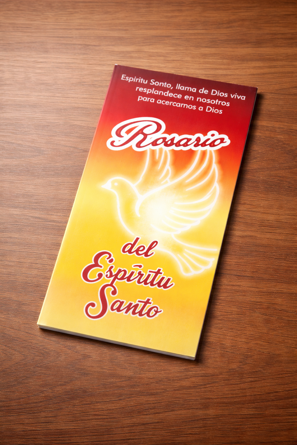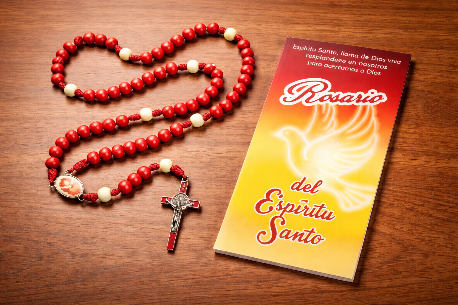 Rosario del Espiritu Santo con 7 misteris de 7 cuentas cuentas redondas de madera color rojo, medalla del Espíritu Santo y crucifijo con detalles rojos. con el triptico podras rezar los 7 misterios que son los 7 dones del Espiritu Santo, Ideal para oración diaria, uso devocional o regalo religioso católico.