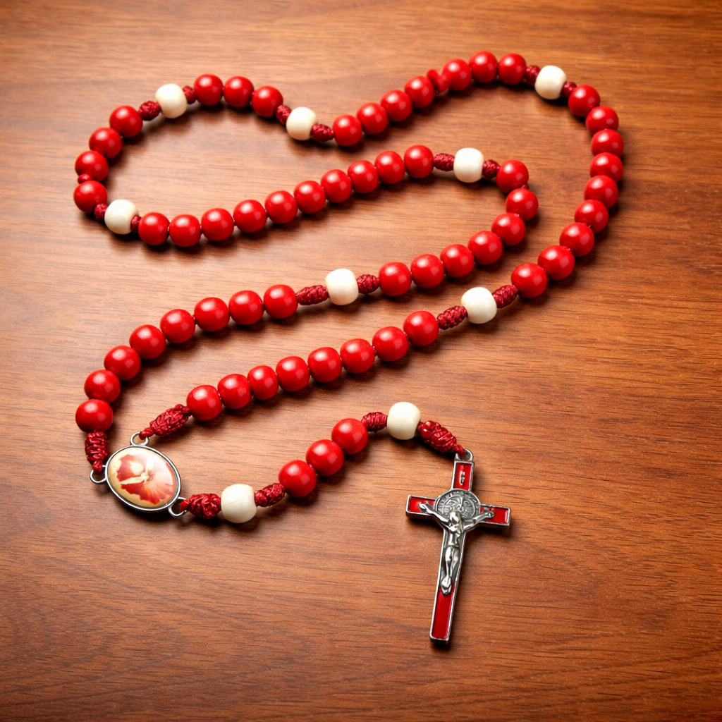 El Rosario del Espiritu Santo con medalla del Espíritu Santo es un símbolo de fe y devoción diseñado para acompañar la oración diaria. Está elaborado con cuentas redondas de color rojo de madera unidas con cordón resistente, combinadas con separadores claros que resaltan su diseño tradicional.