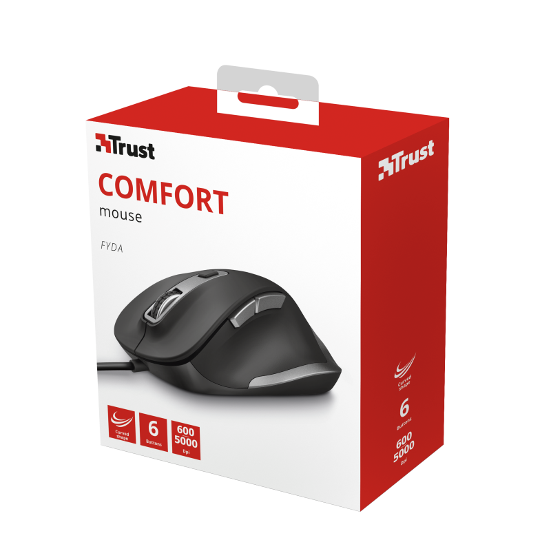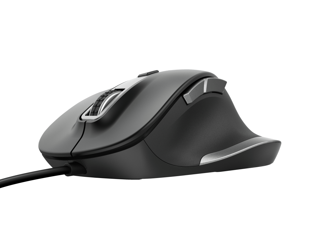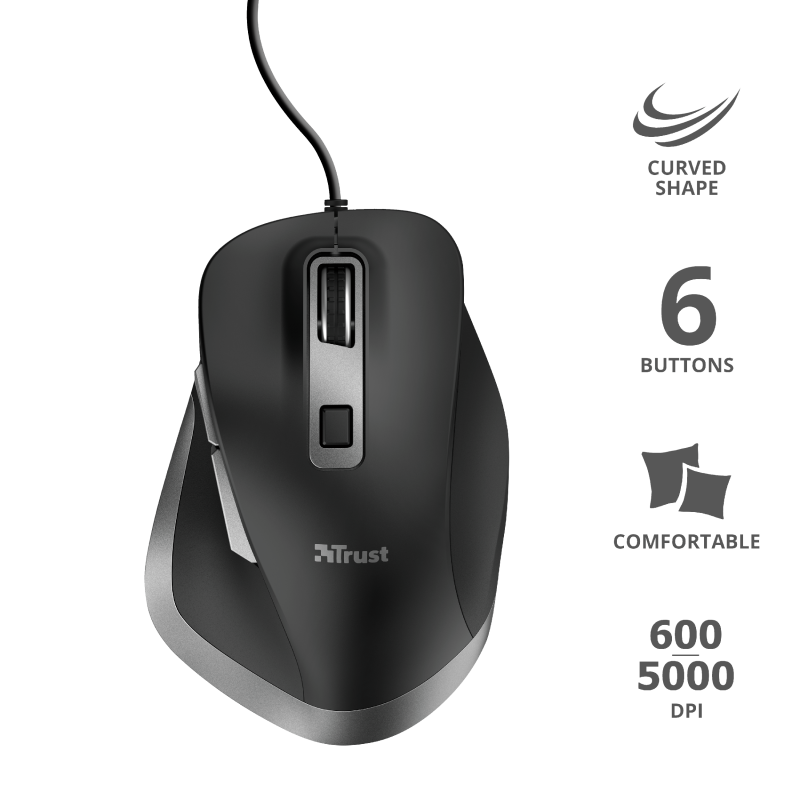 Mouse cableado con forma curva, velocidad ajustable (600 – 1400 – 2800 – 5000 PPP), 6 botones, incluidos 2 botones laterales para accionar de pulgar (adelante – atrás), conexión USB, compatible con Windows, Mac y Chrome, color negro.