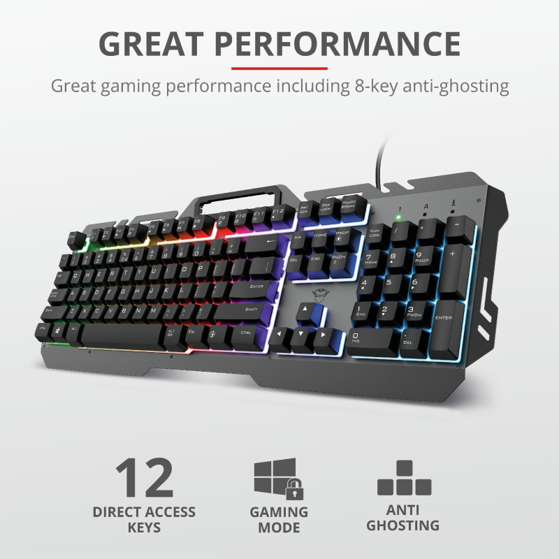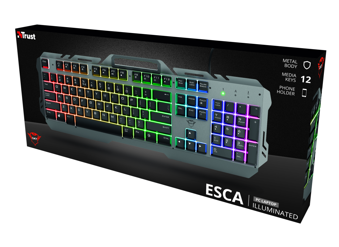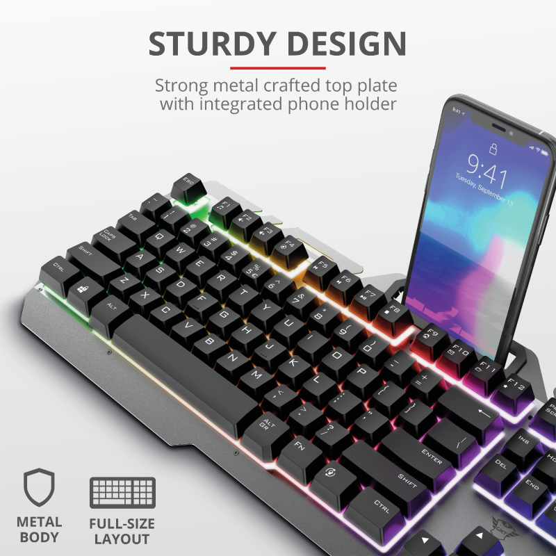 Teclado metálico para gaming con iluminación led efecto arcoíris, 12 teclado de office y multimedia, soporte de teléfono integrado, placa superior metálica, conexión USB 2.0, configuración qwerty, compatible con Windows y Mac os, color black.