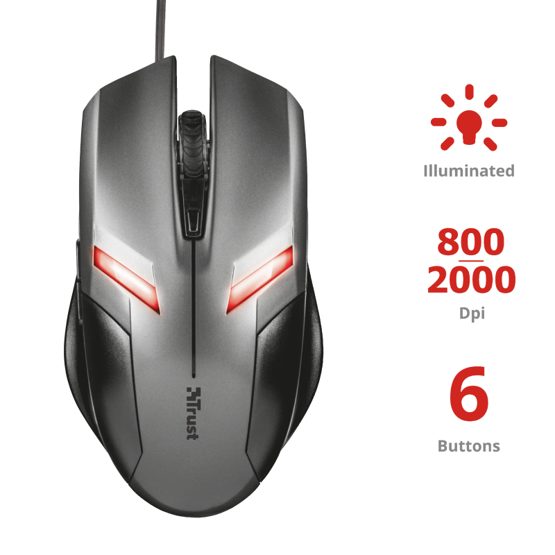 Mouse gamer óptico, 6 botones de respuesta, botón regulador de dpi (800 / 1200 / 1600 / 2000 DPI), iluminación led, conector USB 2.0, compatible con Windows.